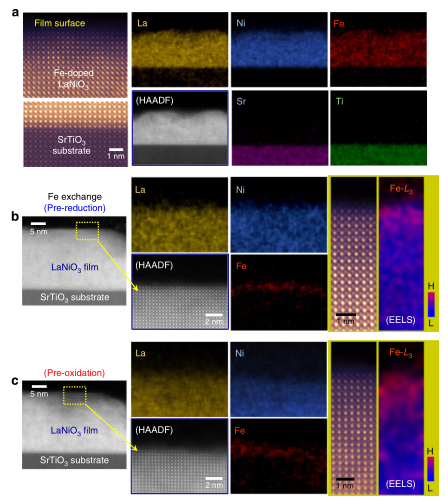 首先,常规的方法在基底上沉积镧镍钙钛矿,然后,点睛之笔就在于怎样将Fe点到钙钛矿上面呢?这时就得派出电化学的方法了,预氧化和预还原都能将Fe离子替换到镧镍钙钛矿中Ni的位置,这就将整篇文章的点睛之处给点到了。最后的成品咋样呢?下面我们就跟随作者的描述来探寻一下这个缤纷多彩,绚丽多姿的化学奇妙世界吧。从基底,材料薄膜和表面在高角度环形暗视野(HAADF)STEM图像和一组EDS化学图(下图a,b,c)中可以看出,预氧化和预还原之后的Fe掺杂LaNiO3薄膜表面分布有Fe离子,说明Fe已经取代Ni原子成为溶质原子,而且从能量分析谱中可以看到Fe交换的深度远远比我们想象的要深,说明Fe原子的钻研能力还挺深,不只是停留在表面呢。