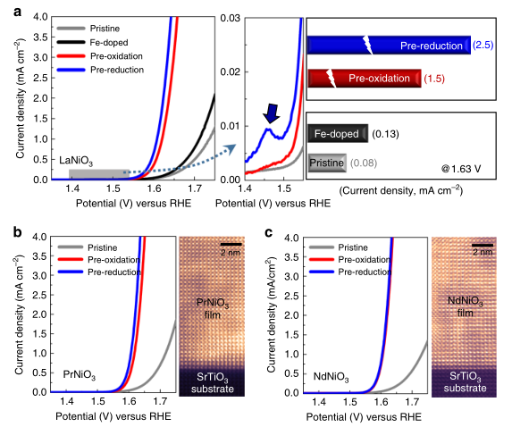 点“铁”之后的钙钛矿的传神之处在何方?这就得数据来说话了。可以看到在掺杂Fe之后的钙钛矿,不论是预氧化交换Fe还是预还原交换Fe,都表现出一飞冲天的优异OER性能。而且在同镧系元素的PrNiO3和NdNiO3钙钛矿中利用相同的电化学技术将Fe离子掺杂到以上钙钛矿中,也可以看到OER性能都有质的飞跃。除此之外,每个样品还存在一个3价Ni离子和2价Ni离子之间的阳极峰,说明表面含有NiO的存在。所以实验中的而每一个细枝末节都得搞清楚,这样才能明确研发产品的优势。