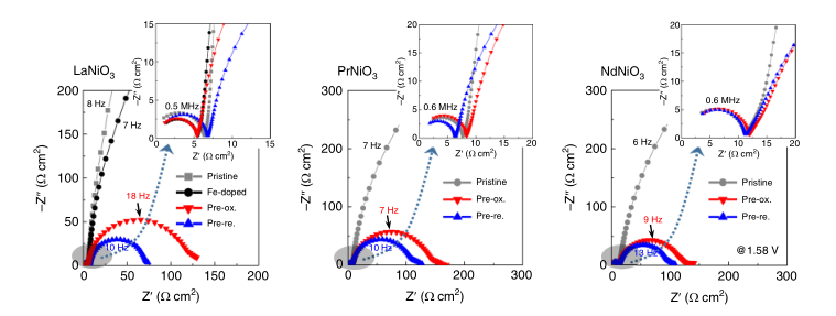 再来看电化学交换Fe之后的钙钛矿的电荷传输情况咋样,从放大图中可以看到预氧化和预还原的交换Fe的三种钙钛矿都表现出两个半圆,第一个处于高频的半圆是属于工作电极和参比电极之间的无补偿电阻(Ru),可以看出每一种钙钛矿的Ru都没有很大的变化,说明无论有没有Fe离子的交换,Ru都没有明显的变化。但在第二个低频区的半圆就显示出非常大的区别了,这时候就能看出交换Fe之后对钙钛矿和电解质界面之间电荷传输的影响了。可以看到用Fe离子交换Ni离子之后,界面电荷传输电阻(Rct)的直径明显变小,说明交换的Fe能够加快钙钛矿与电解质界面之间的电荷传输,降低界面电荷转移的势垒,这就与表现出来的OER性能相吻合。