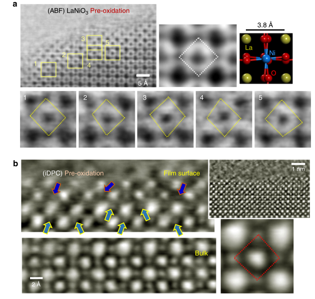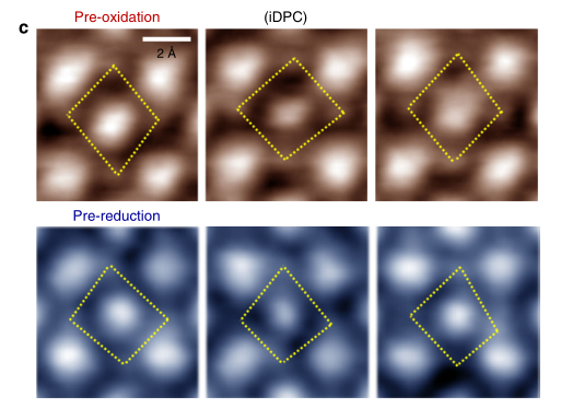 实验数据说明Fe的交换确实提升了OER的性能,这其中的奥妙之处到底是在哪里呢?这恐怕只有了解更深程度的钙钛矿结构才能发现了。这时候扫描电子显微镜(STEM)的作用就显现出来了,通过STEM可以看到预氧化之后的LaNiO3膜上面可以看到氧离子严重偏离原来的位置,就像那快要脱缰的野马,兴奋地离开自己原来的位置,导致原本的八面体氧框架发生了变形。环状亮场(ABF)STEM中就可以确定像氧元素这类轻元素的位置的变化。所以从图中黄色四边形的变化来看,八面体氧确实发生了畸变。更进一步的,另外一种成像方法微分积分相位对比(iDPC)STEM的四象限分段测量图像中可以看到与红色箭头表示的有序氧结构相比,表面区域的氧离子发生了相当大程度的偏移。放大图更加强有力的证明了不论是进行预氧化或是预还原交换Fe之后氧离子的偏移。从图像结果的有力证明可以看出,Ni离子的析出伴随八面体氧骨架的变化,导致氧的严重位移。而且氧的偏移不止发生在XY轴上面,Z轴上也有偏移,只是照出来的图像不是很明显。