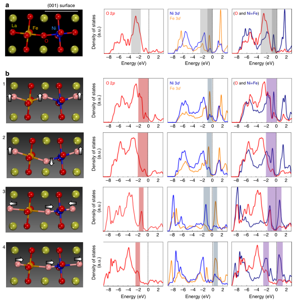 最后理论计算模拟材料的变化对能级的改变进而影响催化的性能是必不可少的,作者就用理论模拟计算LaNiO3的O的2p轨道,Ni/Fe的3d轨道的态密度受到八面体氧畸变的影响。从最初的模型和可能的四中氧畸变模型可以看出,交换Fe之后,O 2p和Ni/Fe 3d轨道都发生了明显的变化,氧(粉红色球)的垂直偏移(第1,2种氧畸变的情况),O 2p的电子态度转移向更高的−2和0eV之间,而Fe 3d(橘色球)电子态也升高,同时也显著的表征出氧替换之后的影响。此外,氧的横向移动导致了Fe 3d的电子态大幅度提升,同时Ni 3d(蓝色球)的电子态也有所增加。可以看出,交换Fe之后引起的氧畸变对Ni的电子态密度影响比没有Fe交换的氧畸变更占优势。所以,氧八面体的畸变是改善过渡金属与氧之间电荷转移的一种非常有效的方法。