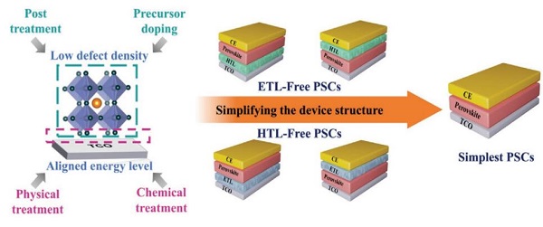 众所周知,太阳能作为一种清洁且取之不尽的能源,是应对全球变暖和能源危机的理想解决方案。因此,科学家们发明了硅、无机薄膜、染料敏化、有机薄膜、量子点、钙钛矿等一系列的光伏材料将光能转化为电能。其中,有机-无机卤化物钙钛矿太阳能电池(PSCs)由于制备简单、成本低廉、性能优异而得到广泛的关注。目前,PSCs的能量转换效率(PCE)最高可达25.2%,超过了大多数其它光伏设备。高性能PSCs通常由电子传输层(ETL)、钙钛矿吸光层和空穴传输层(HTL)组成。在内置电场的驱动下,光生电子和空穴被分离并分别转移到ETL和HTL。其中,ETL可以收集电子并阻挡空穴,而HTL可以收集空穴并阻挡电子。然而,ETL/HTL使PSCs制备过程复杂,增加了生产成本,抵消了钙钛矿材料成本低廉的优势。在PSCs效率逐渐接近理论极限的情况下,微小的进一步提升都需要付出巨大的代价。相反,如果不牺牲光伏性能,而能简化器件结构,将给商业化带来多方面好处。因此,各种无ETL或/和无HTL的PSCs被开发了出来,并且吸引了越来越多的关注。