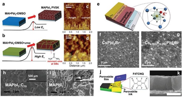 (e)掺杂了K+的PSCs的结构示意图;