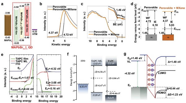 (d)原始钙钛矿和MXene改性钙钛矿的能级图;