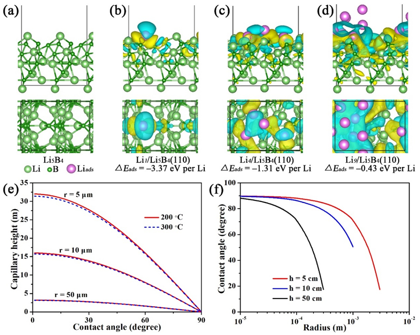 图2. 理论模拟结果。(a-d)不同Li簇(Li1, Li4和Li9)条件下Li5B4对Li原子的吸附能。 (e)在不同温度和毛细半径条件下液态金属Li的毛细高度。(f)当温度为300 ºC 时,在不同毛细高度下接触角和毛细半径之间的关系。
