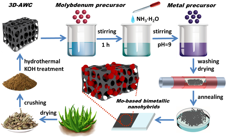 图1. 三维芦荟废弃物衍生碳支撑钼基双金属氧化物的构筑示意图