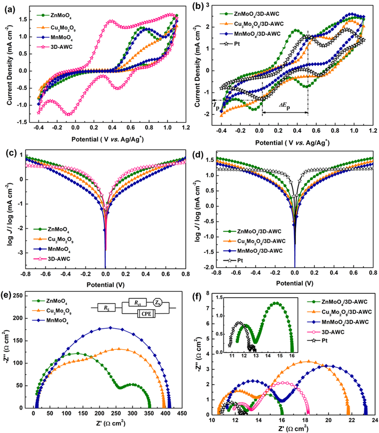 复合催化剂在碘还原和电化学析氢中表现出优异的电化学催化性能和电化学稳定性。作为碘还原电催化剂时,ZnMoO4/3D-AWC,Cu3Mo2O9/3D-AWC和MnMoO4/3D-AWC组装的新一代太阳能电池分别获得了7.65%, 7.33%, and 6.92%的光电转换效率。作为析氢催化剂时,ZnMoO4/3D-AWC,Cu3Mo2O9/3D-AWC和MnMoO4/3D-AWC在1.0 M KOH电解液中,Tafel斜率分别为54 mV dec–1, 76 mV dec–1, 105 mV dec–1。论文创新性地采用密度泛函第一性原理理论计算,对复合催化剂在碘还原和电化学析氢的催化机制进行了理论解释。