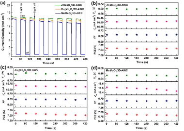 图3. 钼基双金属氧化物及其复合催化材料的光伏性能及碘还原