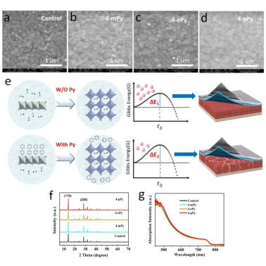(a-d) 控制组和吡啶衍生物修饰的钙钛矿薄膜的SEM图.(e) 结晶成核原理图.(f) XRD图谱. g) 吸收图谱。