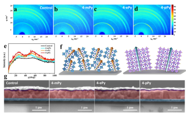 (a-d)控制组和吡啶衍生物修饰的钙钛矿薄膜的GIWAXS. (e)MAPbI3 (110) 晶面GIWAXS强度曲线图.(f)控制组和吡啶衍生物修饰的钙钛矿薄膜的结晶取向堆积模式. (g)钙钛矿不同薄膜器件的截面图.
