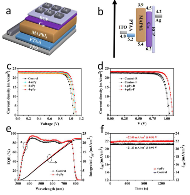 (a-b)钙钛矿太阳能电池器件结构和能级图. (c)不同器件的J-V曲线. (d)控制组和4-pPy修饰的器件的正反扫J-V曲线。(e)控制组和4-pPy修饰的器件的IPCE. (f)控制组和4-pPy修饰的器件, 在最大功率点的稳态电流输出.