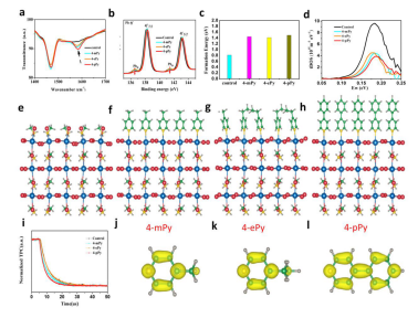 修饰前后钙钛矿薄膜:(a) FTIR曲线.(b)XPS曲线. (c)DFT估算的I空位的形成能. (d) 缺陷态密度(tDOS). (e-h) DFT估算的空间排列. (i) TPC测试. LUMO电子密度分布: (j) 4-mPy, (k)4-ePy 和(l)4-pPy分子.