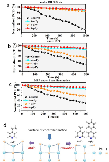 控制组和吡啶衍生物修饰的器件稳定性:a )湿度60%,1000h. b)在85 °C , 500 h的热稳定性曲线. c )600 h的工作稳定性. d )不同衍生物修饰的钙钛矿表面晶格应力情况。