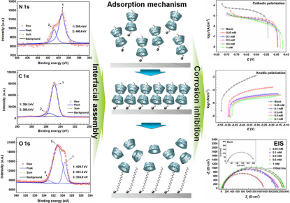 以CCDs与ODA间形成的分子组装体CDDA为例,分子动力学模拟结果显示交联主体,CDs基元间以窄端口相对排列构型的非键能最大,为稳定构像;同时,分子对接计算结果表明客体ODA倾向于依靠CDs内壁一侧形成氢键,结合能为-36.8 kJ/mol。采用动电位极化与电化学阻抗谱评价CDDA对20#钢在模拟蒸汽凝结水环境中的缓蚀效果,当添加浓度为1 mmol/L时,缓蚀率可达93.7%,有效减缓腐蚀。对经CDDA处理后的碳钢进行表面分析发现,表面仅探测到客体ODA的化学信息,说明客体经分子组装后,有效溶解分散于水中,输运至金属表面后被释放。以简便方法合成多活性位点的曲唑酮化合物(TDO),并以此为客体完成组装形成组装体。对应组装体可同时减缓碳钢在中性(3.5% NaCl溶液)与酸性(0.5 mol/L HCl溶液)介质中的腐蚀,缓蚀率可分别达93.1%与90.6%,酸性溶液使客体质子化的影响不大,具有较强普适性。此外,通过原子结合电子多尺度方法,构建客体的显性溶剂模型,经密度泛函计算获取反应性参数,最大限度地接近真实情况;鉴于缓蚀剂在金属/电解质界面的吸附过程,同时包括物理、化学作用,该团队基于perl语言,自建包括反应性力场与非反应性力场的动态立场,通过分子动力学模拟揭示客体在碳钢表面的作用行为。
