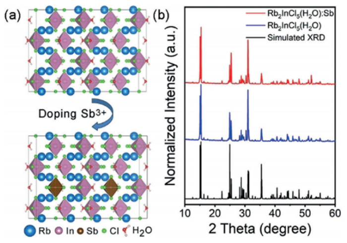 零维(0D)无铅钙钛矿具有独特的结构和光电特性。提出了未掺杂和Sb掺杂的所有无机,无铅,0D钙钛矿单晶A2InCl5(H2O)(A=Rb,Cs),其黄光发射大大增强。为了研究配位H2O的作用,中科院大连化物所的韩克利教授合成了掺Sb的A3InCl6(A=Rb,Cs)并进一步研究。 光致发光(PL)颜色从黄色变为绿色。有趣的是,通过掺杂Sb3+,光致发光量子产率(PLQY)从<2%大幅提高到85-95%。作者通过超快速瞬态吸收技术进一步探索了Sb3+掺杂剂的作用和荧光发射的起源。此外,掺Sb的0D氯化铟铷钙钛矿显示出优异的稳定性。这些发现不仅提供了一种设计新的高性能0D无铅钙钛矿的方法,而且还揭示了结构与PL性能之间的关系。