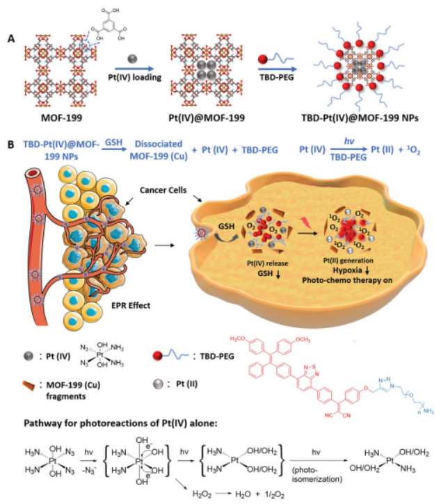 复杂的肿瘤微环境(TME)和非特异性药物靶向限制了光动力疗法联合化疗的临床疗效。新加坡国立大学刘斌教授课题组通过有金属有机框架(MOF)辅助策略,可减少肿瘤缺氧和细胞内谷胱甘肽(GSH)来调节TME,并提供靶向药物的递送和受控释放的化学药物。铂(IV)-重氮基络合物(Pt(IV))装入基于羧酸铜(II)的MOF MOF-199中,并且聚集诱导发射光敏剂TBD与聚乙二醇偶联以封装Pt(IV)-MOF-199。一旦制成的TBD-Pt(IV)@MOF-199纳米粒子被癌细胞内化,MOF-199就会消耗细胞内GSH并分解成片段释放Pt(IV)。在光照射下,释放的Pt(IV)产生可缓解缺氧的O2,并在癌细胞内部产生基于Pt(II)的化学药物。同时,TBD提供了有效的活性氧种类生成和明亮的发射,从而产生了协同的图像引导光化学疗法,具有增强的功效和减轻的副作用。