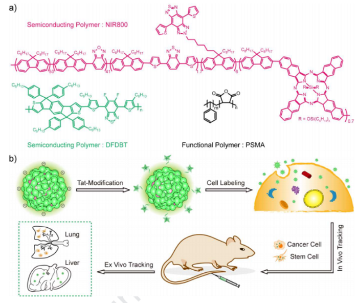 In vivo dynamic cell tracking with long-wavelength excitable and near-infrared fluorescent polymer dots. Biomaterials, 2020, 10.1016/j.biomaterials.2020.120139