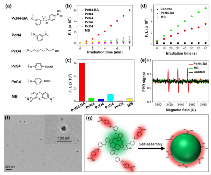 大多数现有的光敏剂(例如卟啉)由于其大的共轭分子结构而经常在水溶液中聚集。由于聚集引起的猝灭,这种聚集通常导致缺乏或产生低水平的活性氧(ROS),这严重阻碍了光敏剂在光动力疗法(PDT)中的应用。福州大学李兴淑教授、韩国梨花女子大学Juyoung Yoon教授和延世大学Dongho Kim教授做出了一个有趣的发现,即硼酸官能化的酞菁(PcN4-BA)显示出罕见的现象,即聚集增强的光动力效应。在水中形成均匀的纳米结构自组装体的能力,高效的ROS生成和硼酸诱导的靶向相结合,使PcN4-BA在抗菌PDT中具有出色的性能。