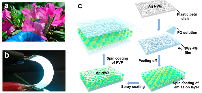 图1 透明FG膜、基于柔性FG膜的ACEL设备及制作过程的示意图