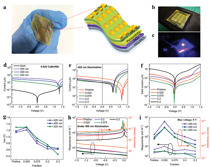 图4 基于CsPbBr3量子点的柔性光探测器阵列在CsBr/KBr处理下的光响应特性