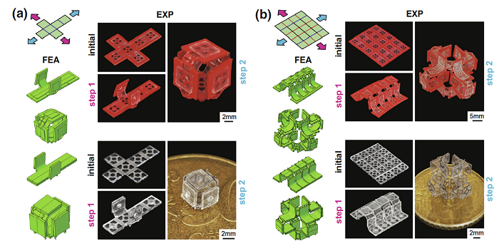 1)折纸启发的平面自折叠可以在三维结构中加入大量表面相关的功能。在过去的几年里,自折叠技术用于开发和制造多种多功能设备。然而,绝大多数的方法仅限于简单的折叠、特定的材料或者尺度大,使它们不适用于微尺度的和形状复杂的设备。在这里,代尔夫特理工大学研究者Amir A. Zadpoor团队提出一种机械自折叠技术。这项技术只需要整体拉伸激活、适用于大范围的材料、允许顺序自锁的多层结构、并可以缩小到微观尺度。该团队结合两个永久变形的剪纸元素的类型,基于多稳定性或塑性变形,用弹性层来创建自折叠的基本单元。折角大小可以使用切割的模式和尺寸来控制,计算模型可以精确地预测弹性层的形变。这些基本单元以模块化的方式组建不同尺度的三维结构。此外,从平面状态开始,该团队不仅能够精确地控制任意复杂的变化模式,而且能灵活的折叠成三维结构。这种方法有许多潜在的应用,包括制造多功能结构、可植入的医疗器械、可形变的医疗设备和微型机器人。该研究以“Kirigami-enabled self-folding origami”发表在Materials Today上。[1]