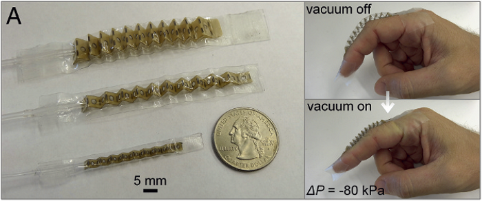 1)人造肌肉为机器的安全的驱动带来了希望。然而,人造肌肉的设计、制造和使用往往受到其材料成本、工作原理、可扩展性、单自由度收缩驱动等的限制。在这里,受折纸的启发,哈佛大学的Robert J. Wood团队提出一个流体驱动的人工肌肉。这个系统只需要一个可压缩的骨架、灵活的皮肤和流体介质。该团队建立了一个力学模型来解释这三个组成部分的相互作用。该文介绍了一种使用不同材料快速且低成本的方法制造不同尺度的人工肌肉。这个人造肌肉可以通过编程来实现多轴运动,包括收缩、弯曲和扭转。这些运动可以被集成拥有多个自由度的系统,产生不同速率的可控运动。该团队的人造肌肉可以在负压力下由液体驱动(相对于环境)。这个特性使其比大多数带电的人造肌肉更安全、有效。压力实验表明这些肌肉可以收缩超过 90% 的初始长度, 产生600 kPa的压强,峰值功率密度大于2kW/kg。这开启了快速设计和低成本制造驱动的大门,适用于多种规模、范围的应用系统,从微型医疗设备到可穿戴机器人、外骨骼以及空间探索的大型可伸展结构。该研究以“Fluid-driven origami-inspired artificial muscles” 发表在PNAS上。[4]