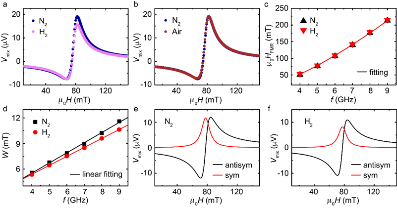 a.通N2或H2时铁磁共振曲线变化;b. 通N2或空气时铁磁共振曲线变化;c. 铁磁共振磁场变化;d. 铁磁共振曲线线宽变化;e. 通N2时,铁磁共振曲线中对称和反对称成分比较;f. 通H2时,铁磁共振曲线中对称和反对称成分比较。