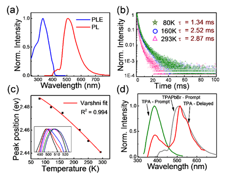 图二:(a)TPAPbBr的荧光光谱;(b)TPAPbBr在不同温度下的荧光寿命;(c)TPAPbBr随温度变化的PL峰位置符合Varshni经验方程;(d)TPA的瞬时(绿色)和延迟的(红色)PL光谱和TPAPbBr的瞬时PL曲线(灰色)。