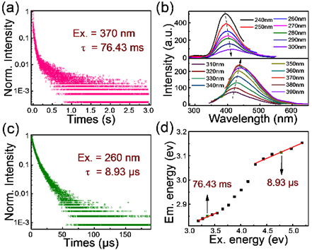 图三:在400 nm(a)和450 nm(c)的发射波长下测得的PLAPbBr的荧光寿命;(b)PLAPbBr的不同激发波长下的PL光谱;(d)PLAPbBr的发射峰能量与相应的激发波长能量之间的关系。