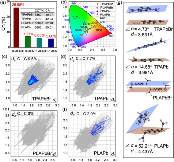 图四:(a)本文所涉及的所有化合物的量子产率柱状图,CCT和CRI和(b)CIE位置,二维指纹图(c-f)和化合物的配体堆积图(g)。