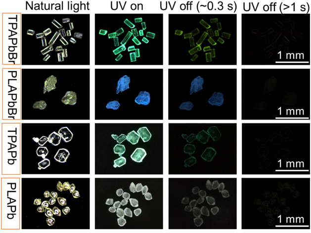 图五:TPAPbBr,PLAPbBr,TPAPb和PLAPb晶体在自然光,紫外灯和紫外灯关闭下(一定时间之后)的光学照片。