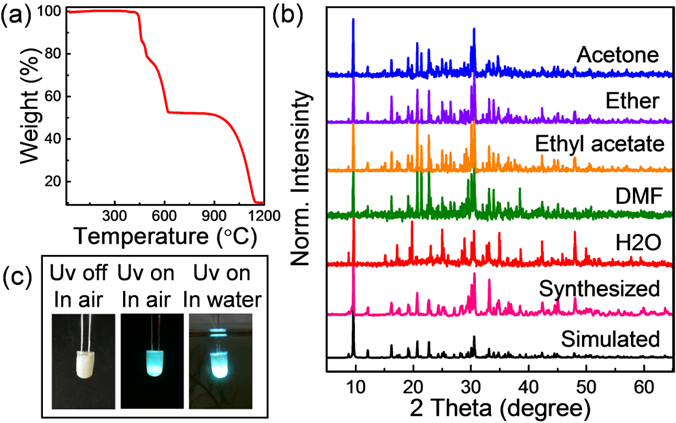 图六:(a)TPAPbBr的热重分析曲线;(b)TPAPbBr在各种溶剂中浸泡15天以上的PXRD;(c)使用TPAPbBr作为涂层材料的LED器件的图片。