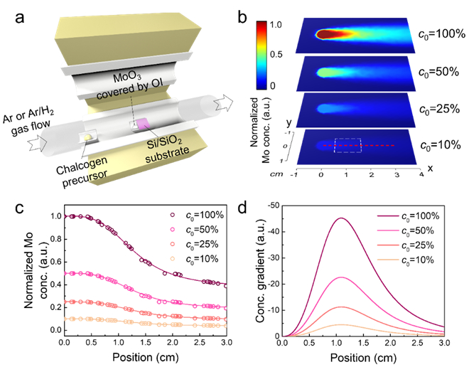 图1. (a) 氧化物辅助的MoX2生长示意图。(b) 不同的Mo释放量下,反应体系中Mo蒸汽浓度空间分布情况的模拟结果。(c) 不同的Mo释放量下,反应体系中Mo蒸汽浓度随着与反应源距离的增加的变化趋势。(d) 不同的Mo释放量下,反应体系中Mo蒸汽浓度梯度随着与反应源距离的增加的变化趋势。