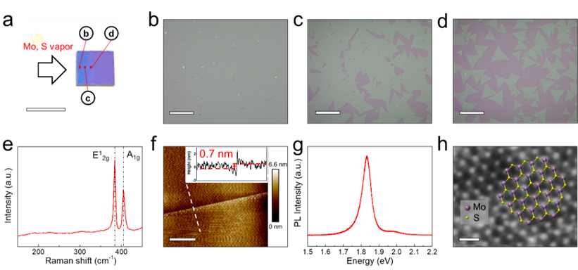 图2. (a) 生长在氧化硅片上的厘米级MoS2单层薄膜的光学图片(标尺为1 cm)以及(b-d) 该衬底上不同位置的放大光学图片(标尺为100 微米)。所制得MoS2单层薄膜的(e) 拉曼光谱, (f) 原子力显微镜图片,(g) 荧光光谱以及 (f) HAADF-STEM图片。