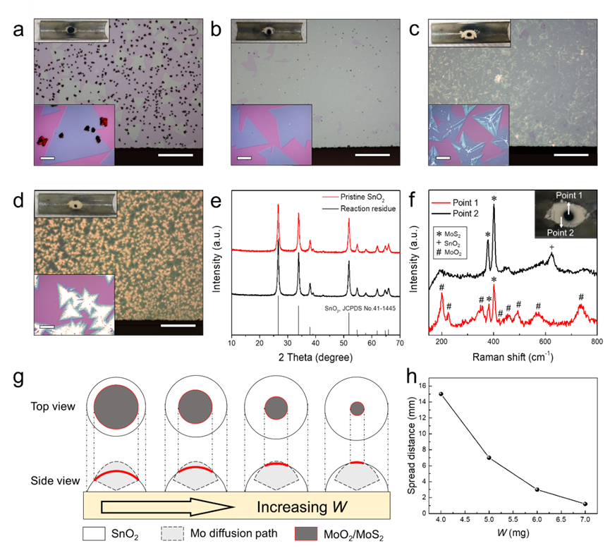 图3. (a-d) 使用不同用量的SnO2 (4 mg, 5 mg, 6 mg, 7 mg)制得的MoS2样品在靠近反应源的边缘位置的光学图片(标尺为200微米)。左上角插图为对应反应残余物的光学图片,左下角插图为对应的放大光学图片(标尺为20微米)。反应残余物的(e) XRD谱和(f) 拉曼光谱。(g) Mo蒸汽在不同用量的SnO2抑制层中的扩散示意图。(h) 随SnO2用量的增加Mo蒸汽在反应体系里有效扩散距离的变化趋势。