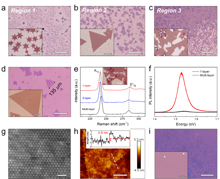 图4. (a-c)Al2O3作为抑制层辅助生长的MoSe2样品在衬底的不同位置上的光学图像(标尺为200微米)。插图为放大图片(标尺为20微米)。(d) 所得最大尺寸的MoSe2单层的光学图片(标尺为200微米)。插图为放大图片(标尺为20微米)。MoSe2样品的(e) 拉曼光谱,(f) 荧光光谱,(g) HAADF-STEM图片以及 (f) 原子力显微镜图片。(i) 制备得到的MoSe2连续单层薄膜的光学图片(标尺为200微米)。插图为放大图片(标尺为20微米)。