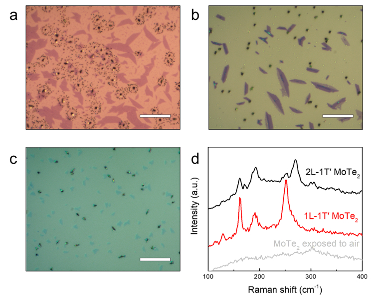 图5. Al2O3作为抑制层辅助生长的1T’ 相MoTe2样品(a 单层,b 双层)的光学图片(标尺为20微米)。(c)在湿度为60%的空气中放置20分钟后的MoTe2单层的光学图片(标尺为20微米)。(d) 样品的拉曼光谱。