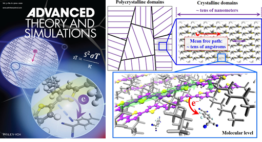 图1,封底和从分子水平、晶域到多晶域薄膜,导电聚合物热电输运关键过程示意图。