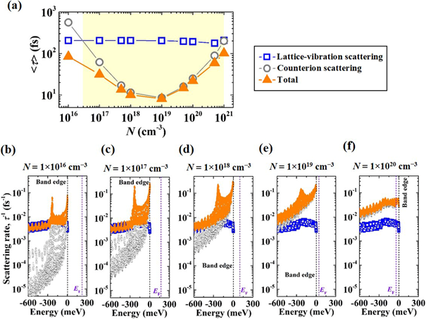 图2,(a) 室温下,P3HT晶域内,平均散射时间(<τ>)随自由载流子浓度(N)的变化。(b − f) 不同自由载流子浓度(N)下,能量依赖的散射率(τ−1)。