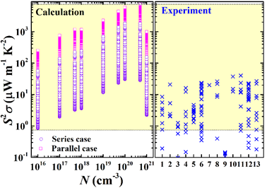 图3,室温下,不同自由载流子浓度(N),不同微晶取向和大小下,多晶P3HT计算的功率因子(S2σ)与十三组不同实验报道结果的比较。