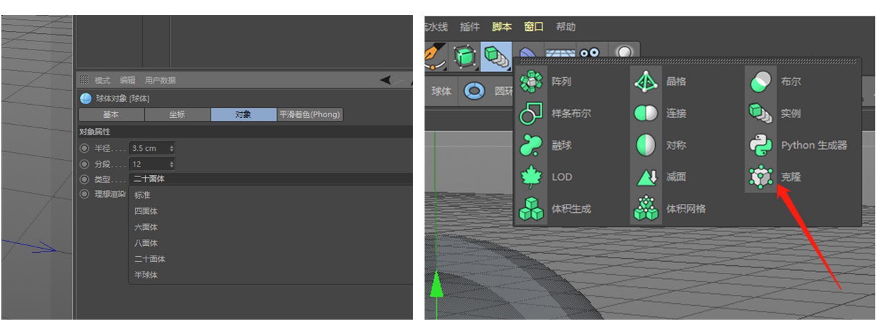2.1 新建一个球体,半径3.5 分段12 类型二十面体(可自行调整,分段越多越容易卡顿);在生成器一栏创建克隆生成器,并将新球体拖拽为克隆的子集。