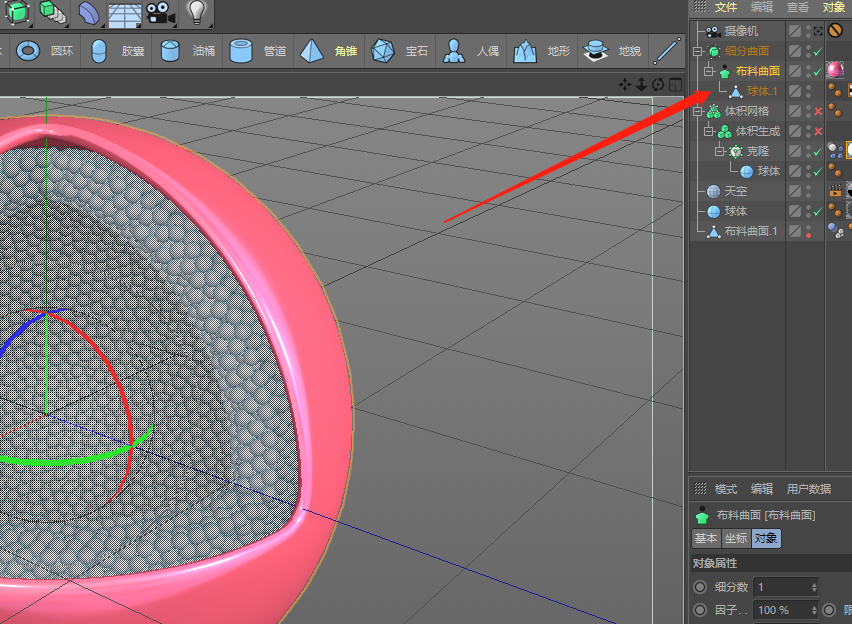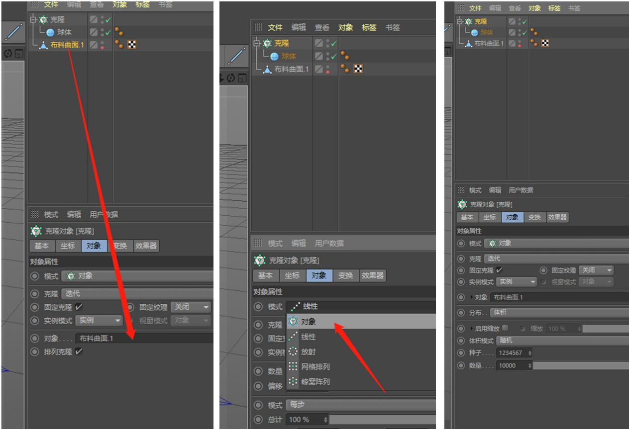 2.2 将克隆模式设置为对象,将布料曲面拖入克隆的对象框,分布方式改为体积,数量设置5000~10000(视模型大小而定)。