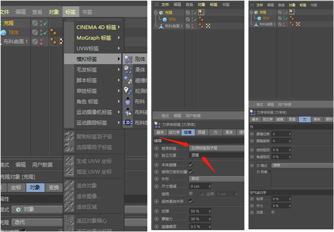 2.3 选中克隆,创建刚体标签(标签→模拟标签→刚体);标签碰撞设置:应用标签到子级,独立元素选顶层;力属性中,跟随位移设置为6(可自行调整)。
