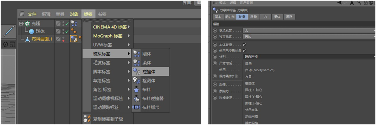 2.4 给对象布料曲面1添加碰撞体标签;碰撞属性中,外形改为静态网格。