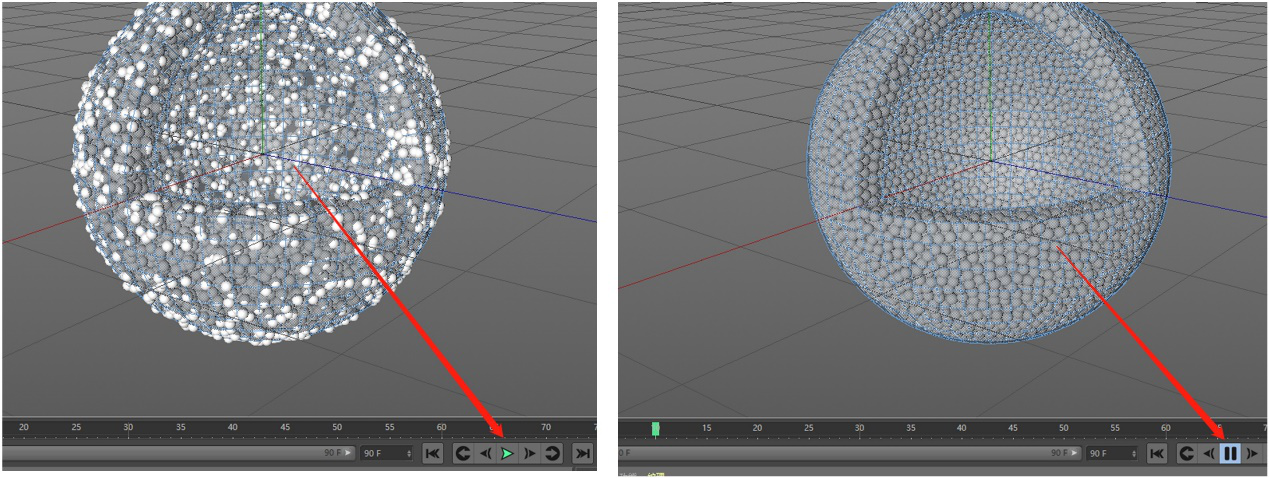 2.6 单击播放按钮,播放小球运动动画,播放到10帧之后,小球基本运动到与网格外形相对应的位置。