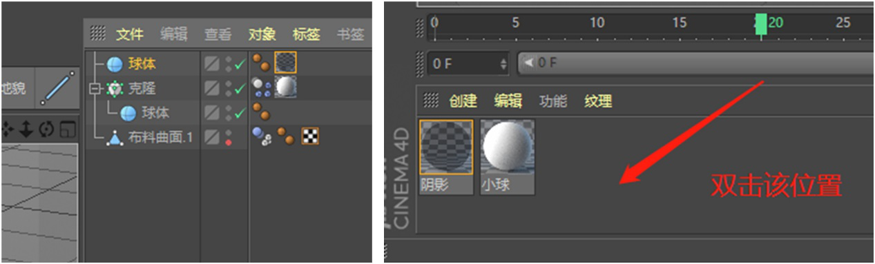 2.7 新建一个球体来作为阴影效果,球体位置和属性保持默认就好;双击材质区空白位置,可新建材质,这里新建两个材质,将材质分别拖拽给相应的对象(球体和克隆)。