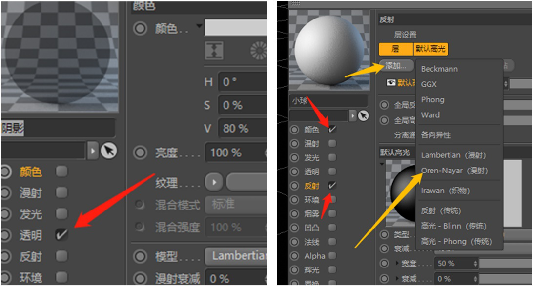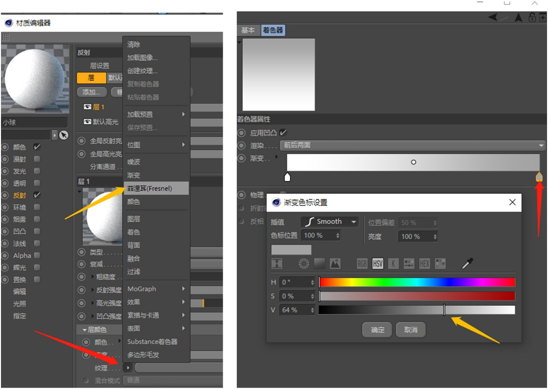 2.8 双击材质球打开材质编辑器,材质设置如图:阴影材质只勾选透明通道,通道颜色可调整阴影深度;小球材质勾选颜色和反射通道,在反射层中添加一个漫射层,漫射层颜色添加一个菲涅尔纹理,在菲涅尔纹理设置中调整色标的颜色和位置,可以改变小球的颜色。