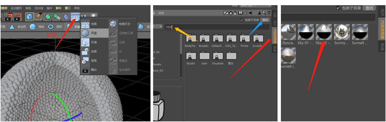 2.9 鼠标左键长按地面选项,在弹出菜单中选择天空给环境添加一个天空背景,右侧内容浏览器查找HDRI,可找到软件预设的HDRI材质球,这里可以选一个合适的,双击添加到材质窗口,并将该HDRI材质球拖拽给刚刚创建的天空。