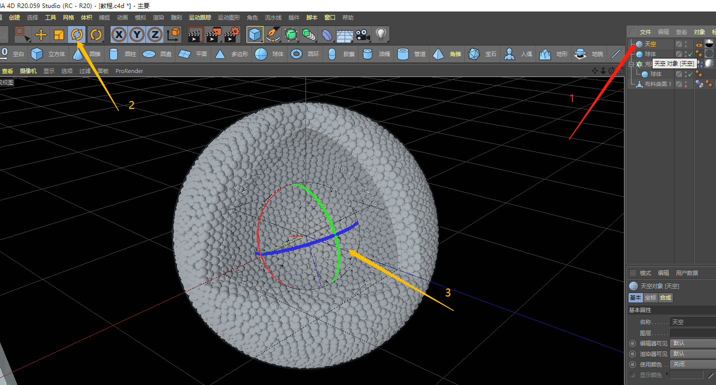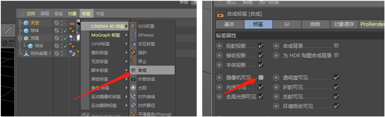 2.10 选中天空,选择旋转工具,可对天空的角度进行旋转,来找到合适的光照角度;调整好角度后,为天空添加一个合成标签,标签设置中取消勾选摄像机可见,这样渲染时可以只渲染光照不渲染天空。