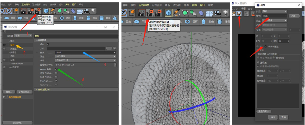 2.11 下面是渲染设置,如图,单击打开渲染设置窗口,在保存一栏中勾选Alpha通道,格式设置为PNG,这样可以渲染出透明背景的图片;找好角度后,单击渲染到图片查看器,等等渲染完成后点击保存即可。(要保存透明背景图片PNG+Alpha)